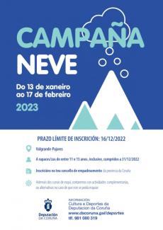 A Deputación Provincial da Coruña organiza unha CAMPAÑA DE NEVE na estación invernal de VALGRANDE-PAJARES na que poderán participar os nenos/-as empadroados nun concello da provincia de A Coruña, de 11 a 15 anos inclusive (cumpridos a 31 de decembro de 2022). Terán prioridade os/as nenos/as que non foran a ningunha campaña da neve da Deputación.